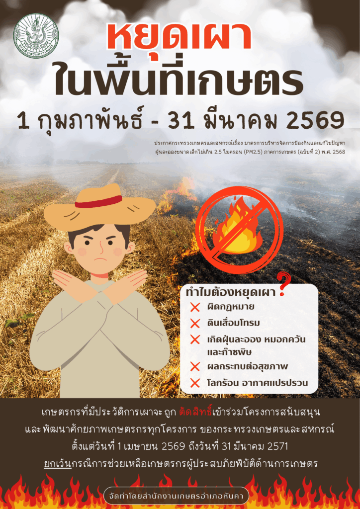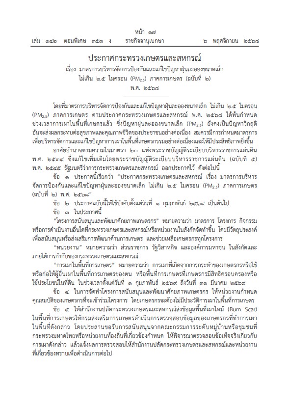 ประกาศกระทรวงเกษตรและสหกรณ์เรื่อง มาตรการบริหารจัดการป้องกันและแก้ไขปัญหาฝุ่นละอองขนาดเล็ก ไม่เกิน 2.5 ไมครอน (PM2.5) ภาคการเกษตร