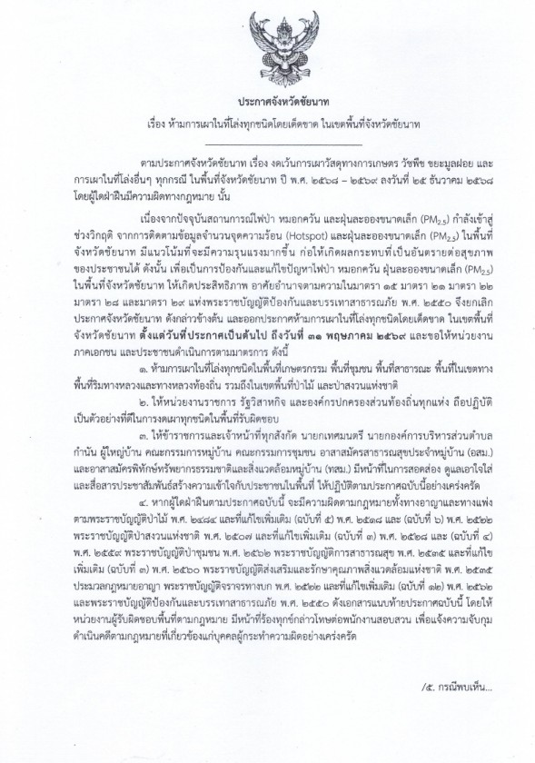 ประกาศจังหวัดชัยนาท เรื่อง ห้ามการเผาในที่โล่งทุกชนิดโดยเด็ดขาด ในเขตพื้นที่จังหวัดชัยนาท