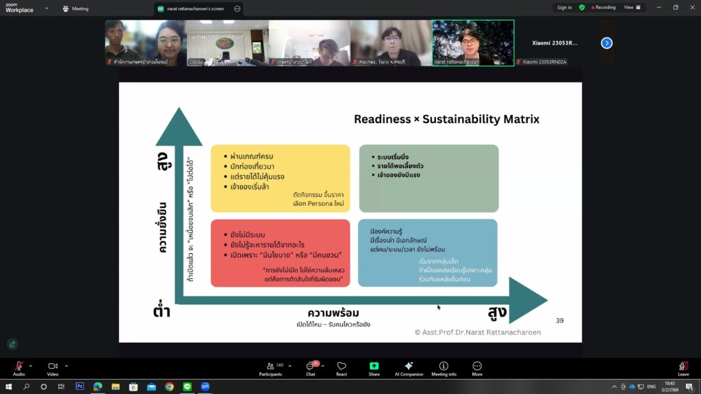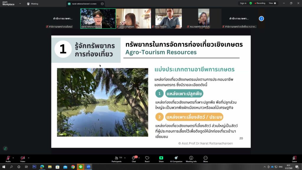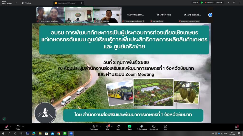 วันที่ 3 กุมภาพันธ์ 2569 นายสุรัชชัย เปียวิเศษ นักวิชาการส่งเสริมการเกษตรชำนาญการ รักษาราชการแทนเกษตรอำเภอมโนรมย์ มอบหมายให้น.ส.พัชรินทร์ กิติรัตน์ นักวิชาการส่งเสริมการเกษตรชำนาญการและ นายสุนิธิ แสงนาค เกษตรกรต้นแบบศพก.อำเภอมโนรมย์ เข้าร่วมอบรมการพัฒนาทักษะเป็นผู้ประกอบการท่องเที่ยว เชิงเกษตรแก่เกษตรกรต้นแบบ ศูนย์เรียนรู้การเพิ่มประสิทธิภาพการผลิตสินค้าเกษตรและศูนย์เครือข่าย เพื่อเสริมสร้างความรู้ ความเข้าใจ และทักษะด้านการเป็นผู้ประกอบการท่องเที่ยวเชิงเกษตร สามารถนำองค์ความรู้ไปประยุกต์ใช้ในการพัฒนาแหล่งเรียนรู้ทางการเกษตร เพิ่มมูลค่าสินค้าและบริการ ตลอดจนส่งเสริมการท่องเที่ยวเชิงเกษตรในพื้นที่ให้เกิดความเข้มแข็งต่อไป ผ่านระบบออนไลน์ Zoom Meeting จาก ห้องประชุมสำนักงานส่งเสริมและพัฒนาการเกษตร เขตที่ 1 จังหวัดชัยนาท
