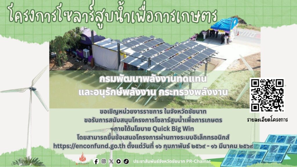 ข่าวประชาสัมพันธ์ขอเชิญหน่วยงานราชการ ในจังหวัดชัยนาทขอรับการสนับสนุนโครงการโซลาร์สูบน้ำเพื่อการเกษตร ภายใต้นโยบาย Quick Big Winกรมพัฒนาพลังงานทดแทนและอนุรักษ์พลังงาน กระทรวงพลังงาน โดย สำนักงานพลังงานจังหวัดชัยนาท adminmanorom / มีนาคม 11, 2026 ขอเชิญหน่วยงานราชการ