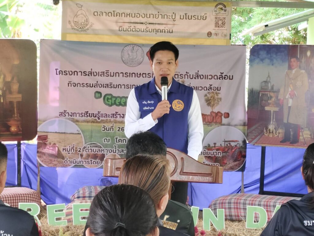 วันที่ 26 มีนาคม 2569 นายสุรัชชัย เปียวิเศษ นักวิชาการส่งเสริมการเกษตรชำนาญการ รักษาราชการแทนเกษตรอำเภอมโนรมย์ พร้อมด้วยเจ้าหน้าที่สำนักงานเกษตรอำเภอมโนรมย์ จัดเวทีชุมชน/เวทีรณรงค์ “Green Gain Day” สร้างการเรียนรู้และสร้างแรงจูงใจ “ไม่เผา แต่ได้รายได้” ภายใต้โครงการส่งเสริมการเกษตรที่เป็นมิตรกับสิ่งเเวดล้อม ประกอบไปด้วยกิจกรรมการจัดเวทีเสวนาในหัวข้อเรื่อง “ปัญหาเเละผลกระทบจากการเผาในพื้นที่การเกษตร” เเละกิจกรรมฝึกปฏิบัติการทำเห็ดฟางตะกร้า เเละทำปุ๋ยหมักแบบไม่พลิกกลับกอง ซึ่งมีเกษตรกรเป้าหมายเข้าร่วมจำนวน 20 ราย โดยมีนายจรัญ เรืองรุ่ง ปลัดอำเภอหัวหน้ากลุ่มงานบริหาร งานปกครองเป็นประธานในพิธี ณ โคก หนอง นา ย่ากะปู่ หมู่ที่ 2 ตำบลหางน้ำสาคร อำเภอมโนรมย์ จังหวัดชัยนาท