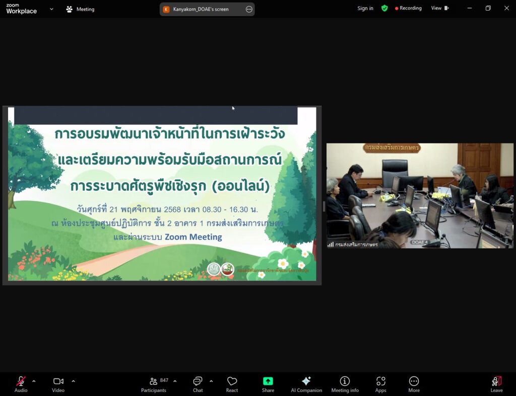 วันศุกร์ที่ 21 พฤศจิกายน 2568 เวลา 08.30 น. นายสุทิน จันอิน นักวิชาการส่งเสริมการเกษตรชำนาญการ รักษาราชการแทนเกษตรอำเภอหนองมะโมง มอบหมายให้นางสาวรัตติยา สมผกา นักวิชาการส่งเสริมการเกษตร เจ้าหน้าที่ผู้รับผิดชอบงานอารักขาพืช ระดับอำเภอ เข้าร่วมอบรมพัฒนาเจ้าหน้าที่ในการเฝ้าระวังและเตรียมความพร้อมรับมือสถานการณ์การระบาดเชิงรุก (ออนไลน์) ผ่านระบบ Zoom Meeting โดยกองส่งเสริมการอารักขาพืชและจัดการดินปุ๋ย ณ สำนักงานเกษตรอำเภอหนองมะโมง จังหวัดชัยนาท