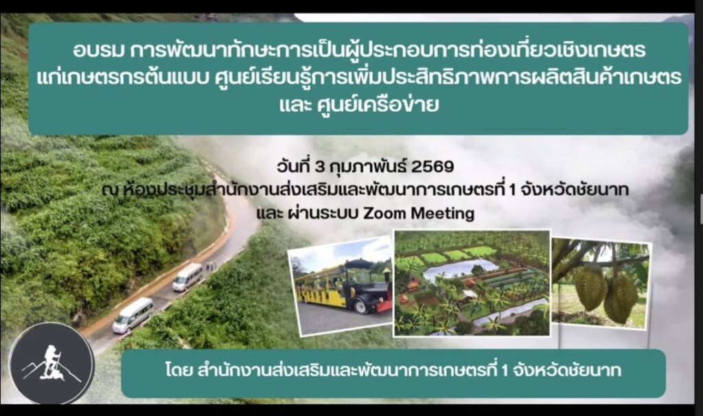 วันที่ 3 กุมภาพันธ์ 2569 นางสาววิษากรานต์ ตุ่นทอง เกษตรอำเภอสรรพยา มอบหมายให้นายชัยวุฒิ แย้มวัด นักวิชาการส่งเสริมการเกษตรชำนาญการ และ นายนิคม ชูเมือง เกษตรกรต้นแบบ เข้าร่วมอบรมการพัฒนาทักษะเป็นผู้ประกอบการท่องเที่ยวเชิงเกษตรแก่เกษตรกรต้นแบบ ศูนย์เรียนรู้การเพิ่มประสิทธิภาพการผลิตสินค้าเกษตรและศูนย์เครือข่าย เพื่อเสริมสร้างความรู้ ความเข้าใจ และทักษะด้านการเป็นผู้ประกอบการท่องเที่ยวเชิงเกษตร ให้แก่เกษตรกรต้นแบบและศูนย์เครือข่าย สามารถนำองค์ความรู้ไปประยุกต์ใช้ในการพัฒนาแหล่งเรียนรู้ทางการเกษตร เพิ่มมูลค่าสินค้าและบริการ ตลอดจนส่งเสริมการท่องเที่ยวเชิงเกษตรในพื้นที่ให้เกิดความเข้มแข็งต่อไป ผ่านระบบออนไลน์ Zoom Meeting จาก ห้องประชุมสำนักงานส่งเสริมและพัฒนาการเกษตรเขตที 1 จังหวัดชัยนาท