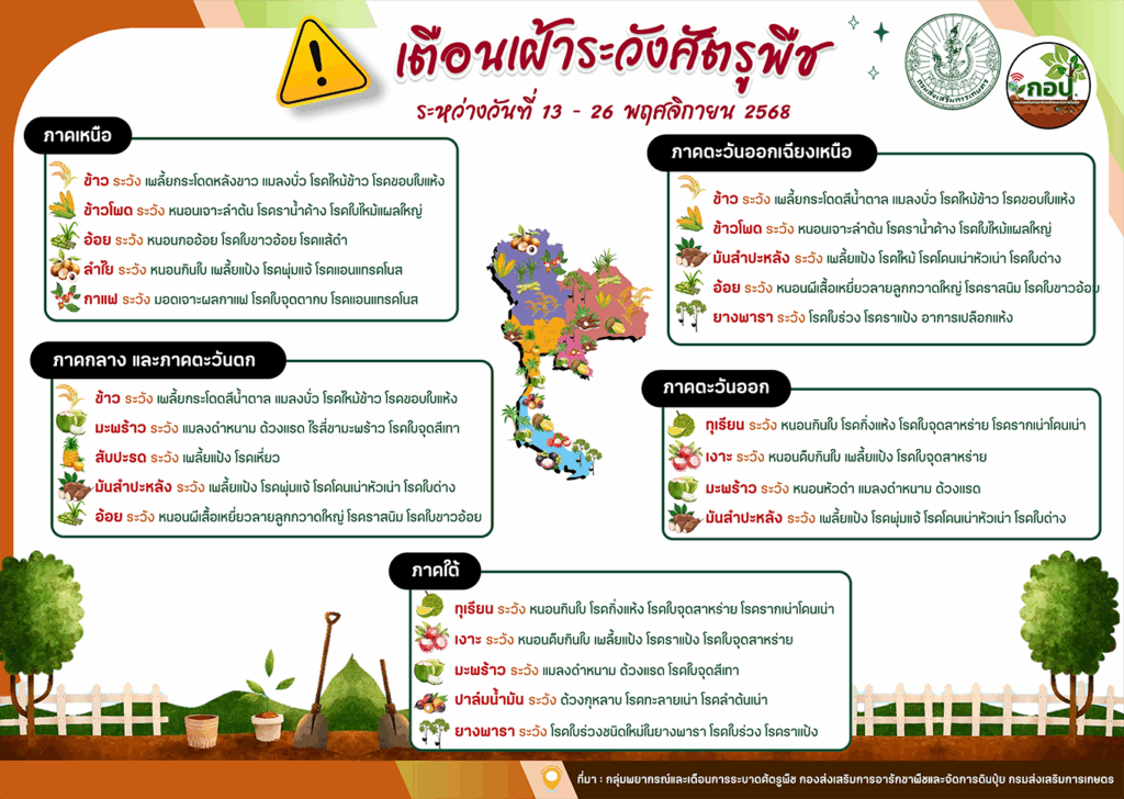 ข่าวแจ้งเตือนเตือนเฝ้าระวังศัตรูพืชระหว่างวันที่ 13 – 26 พฤศจิกายน 2568 adminsapphaya / พฤศจิกายน 18, 2025