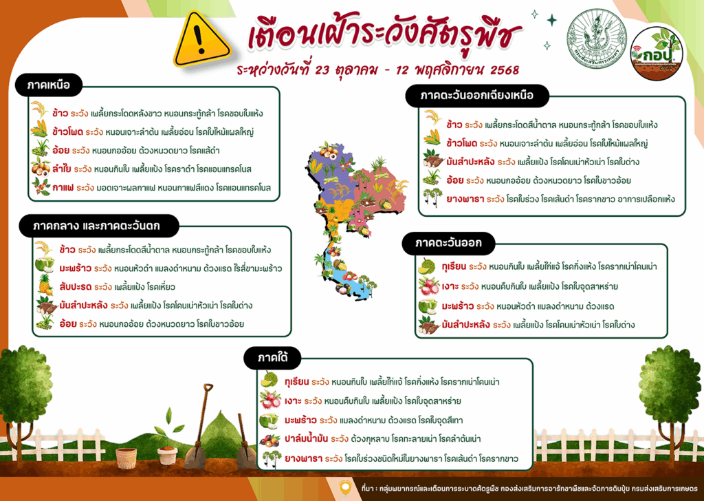 ข่าวแจ้งเตือนเตือนเฝ้าระวังศัตรูพืชระหว่างวันที่ 23 ตุลาคม – 12 พฤศจิกายน 2568 adminsapphaya / พฤศจิกายน 10, 2025